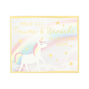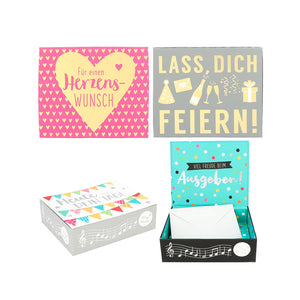 Inhalt: 1 Soundbox. Mit Motivdruck: Mögen alle Träume & Wünsche in Erfüllung gehen!. Klappt man die Box auf ertönt Musik mit dem Song: Youll be in my heart. In der Box liegt ein passend gestalteter Umschlag für Geld oder Gutscheine. Grösse: 9,5x11,2x3,5cm.